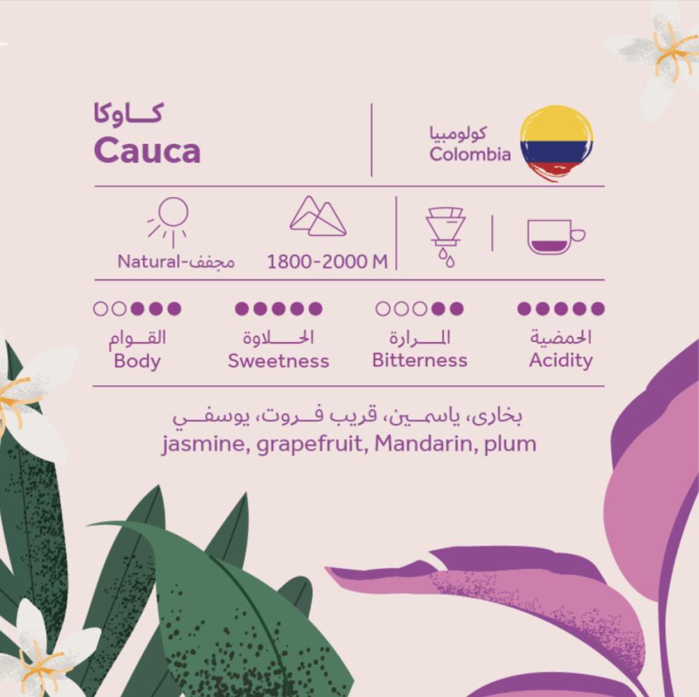 محصول كاوكا كولومبي فاخر يتميز بمذاقٍ معقد وحلاوةٍ عالية، زُرع على ارتفاع يتراوح بين 1800 و2000 متر فوق مستوى سطح البحر، وتمت معالجته بالطريقة المجففة الطبيعية.